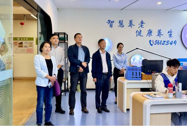 陳鵬一行深入淮海康養中心、愛暉頤養院,查看長者活動室、康復理療區、社區食堂及智慧養老服務平臺等重點區域,了解智慧養老平臺功能整合與新區域環境設計有關情況,交流醫養結合服務體系建設意見建議。