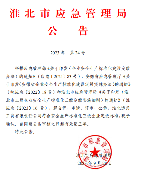 筆者了解到,運興公司順利通過淮北市應急管理局“安全生產標準化三級企業”評審驗收。
