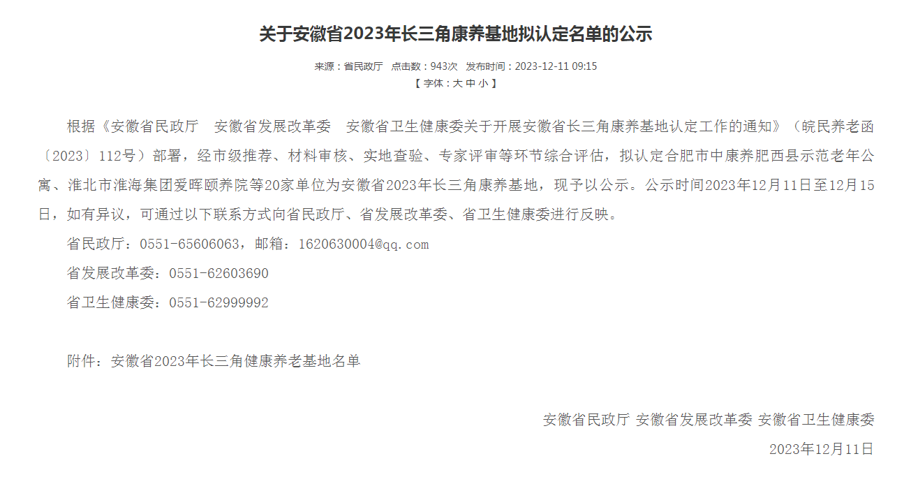 近日,相王現代所屬愛暉頤養院成功被安徽省民政廳認定為“2023年長三角康養基地”。
